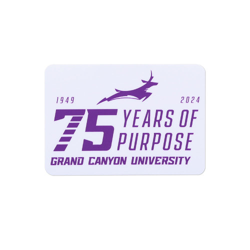 Join us in celebrating GCU's 75th Birthday with this sticker! Across the white sticker there is a small, purple running lope with "1949" on its right and "2024" on its left. Below it reads, "75 YEARS OF PURPOSE" and then "GRAND CANYON UNIVERSITY" below that. With 75 years of a purpose to help student's find their purpose, Grand Canyon University could not be more excited to blow out all 75 candles on the cake this year! Buy this sticker today to show you are celebrating the school's 75th anniversary with us! Lopes Up!