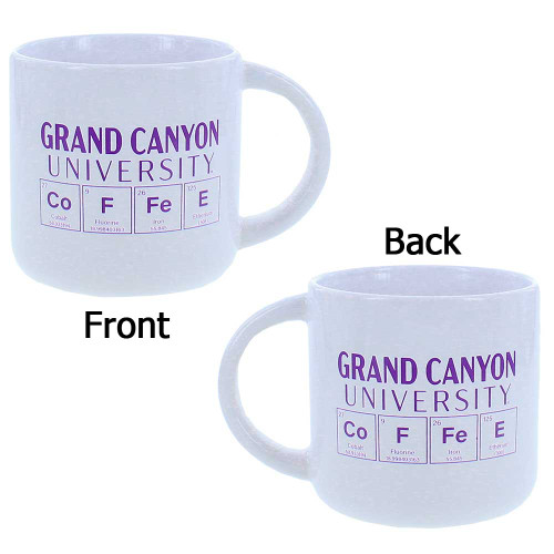 This mug is perfect for showing off your science side! The mug is white and the graphic is on the front and back. It says "GRAND CANYON" on the top with "UNIVERSITY" below in purple. Below the there are the "elements" for cobalt (C), Fluorine (F), Iron (FE), and Etherium (E), that spell out "COFFEE." Show off your new coffee mug today! Lopes up!